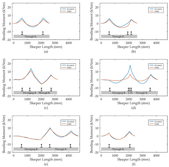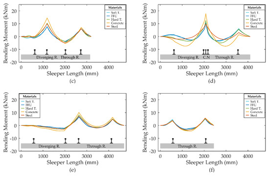 Bending moment distributions of specific sleepers with reference to different sleeper types: (a) sleeper at the entrance; (b) sleeper under the switch blades; (c) sleeper at the closure panel; (d) sleeper under the crossing nose; (e) the longest sleeper; (f) the shortest sleeper.