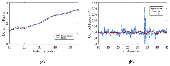 Multibody responses: (a) Dynamic factors for two cases: track with no irregularities and with irregularities; (b) contact forces for minimum and maximum speed.
