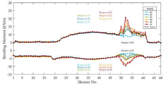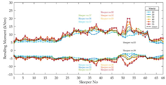 In Figure 6, the longitudinal bending moment distribution is displayed for a case when the vehicle runs over a track without irregularities. The bending moment distribution shows that maximum bending moments at lower speeds gradually increase with the sleeper length, with the exception of a small drop at the sleepers under the crossing nose. The relatively lower bending moments at the crossing panel could be a consequence of the increased total rail stiffness, which evenly distributes the load between sleepers. The distinct property of Figure 6 is that significant variations could be observed only at the crossing panel with no track irregularities. As can be seen from Figure 6, maximum positive bending moments as well as maximum negative bending moments mostly take place at sleepers close to the crossing nose and the deviation between the bending moments at minimum and maximum speeds is large. Another insight stemmed from Figure 6 is that the open switch blade increases the maximum negative bending moment; therefore, the maximum negative bending moment starts to increase a few sleepers before.