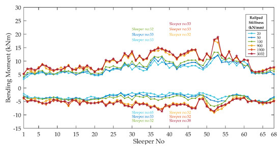 Longitudinal bending moment distributions with reference to different rail pad stiffness.