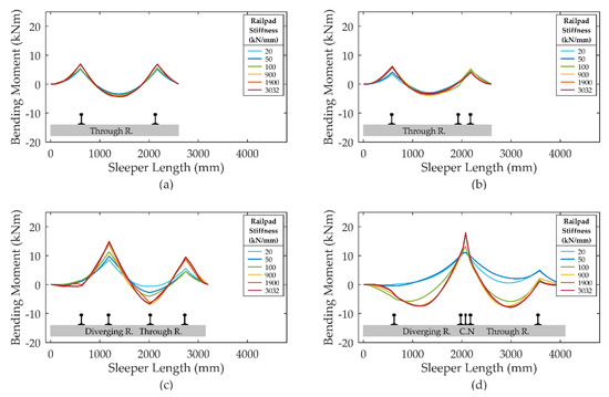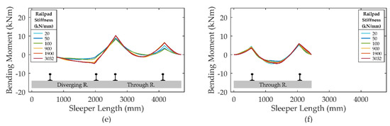 Bending moment distributions of specific sleepers with reference to different rail pad stiffness: (a) sleeper at the entrance; (b) sleeper under the switch blades; (c) sleeper at the closure panel; (d) sleeper under the crossing nose; (e) the longest sleeper; (f) the shortest sleeper.