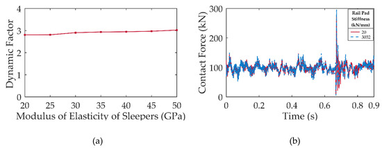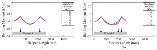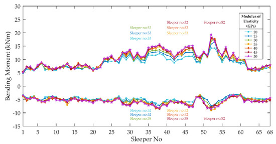 As can be seen from Figure 12, changing the modulus of elasticity has limited influence on the dynamic factors, ranging from 2.8 to 3.0. A similar finding could be reached for contact forces [51,52]. (Figure 12b) By contrast, the maximum bending moment distributions along a turnout are affected by different moduli of elasticity. (Figure 13) A high modulus of elasticity elevates the stiffness of a sleeper; therefore, the effective length of the sleeper supported by ballast also changes.