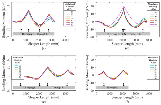 Bending moment distributions of specific sleepers with reference to different moduli of elasticity: (a) sleeper at the entrance; (b) sleeper under the switch blades; (c) sleeper at the closure panel; (d) sleeper under the crossing nose; (e) the longest sleeper; (f) the shortest sleeper.