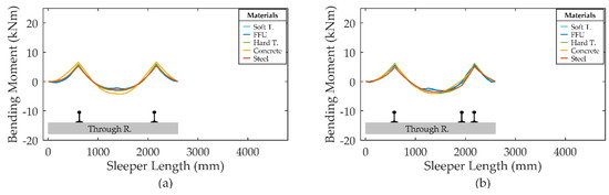 Apart from concrete, the common materials in sleeper design are timber, steel, and composite materials such as Fibre-reinforced Foamed Urethane (FFU). In practice, the choice of materials can cause some drawbacks. For instance, timber sleepers are vulnerable to biological and mechanical degradation. A comparison for various materials is presented in Figure 15. The maximum positive and negative bending moments have common behavior with other simulations. For instance, the asymmetrical properties still exist on the sleepers, such as the sleeper at the closure panel. The discrepancies in bending moment distributions is more perceptible for the sleeper at closure and crossing panels. Aside from the common properties, the highest bending moment takes place when the concrete sleeper is preferred. The magnitude of the maximum positive bending moment is 17 kNm at the section under the crossing nose. Regarding only the sleepers under the crossing nose, soft timber and FFU sleepers could be used interchangeably with those of hard timber and steel since they generally show similar bending moment distributions in general. It seems that steel could be a better choice for the sleepers under the crossing nose since they have better bending moment distributions. Nevertheless, steel sleepers are expensive, require extra care during maintenance, and are subject to corrosion. FFU could be an alternative to concrete sleepers/bearers. Specifically, it has been reported that FFU provides good mechanical properties and works well in high frequency regions [53,54,55].