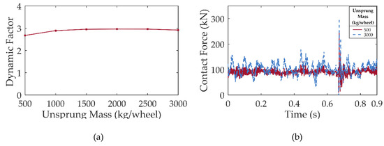 The effective masses in the wheel-rail interaction are the unsprung (wheel) masses [6]. The effects of different unsprung masses are considered in the parametric study. The effects of the unsprung masses on both contact forces and the dynamic factor are presented in Figure 16. The dynamic factor corresponding to different wheel loads reveals an unexpected phenomenon. The reason is the definition of the dynamic factor, the maximum force (impact force) over static force. It could be inferred from the figure, that the impact forces increase with higher wheel masses and reach a horizontal asymptote. In other words, the impact forces become gradually less sensitive to higher wheel masses; in the meantime, static force always increases with wheel mass. As a consequence, the dynamic factor first shows a rise followed by a fall, which is consistent with the findings presented in [36]. Regarding Figure 16a, it can be concluded that the effect of unsprung masses on the dynamic factor is limited. By contrast, the heavier wheels have a significant effect and produce higher wheel-rail contact force fluctuations (Figure 16b) that are important for the fatigue behavior.