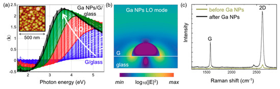 Ga nanoparticles (NPs) on G/glass substrate. (a) Extinction coefficient spectra recorded in real time during Ga NP deposition on the G/glass substrate; the first blue spectrum refers to G/glass, while the last black spectrum refers to the Ga NPs/G/glass; the arrow indicates Ga NP deposition. As an inset is shown an atomic force microscopy (AFM) image of the Ga NP morphology. (b) Near-field distribution of the electromagnetic field when the Ga NPs are excited at their longitudinal (LO) mode. (c) Raman spectra of the graphene layer/glass before and after Ga NP deposition.