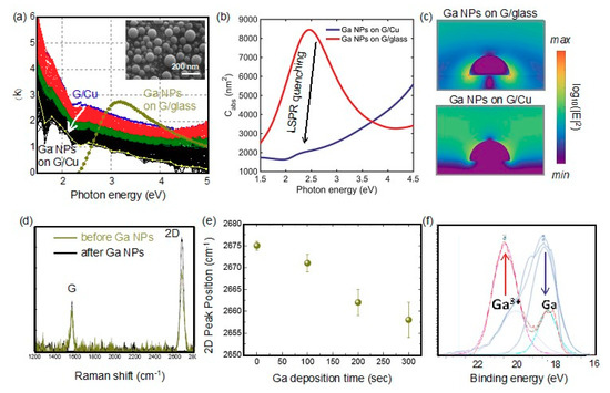 Specifically, while Ga NPs on G/glass show a high near-field enhancement at the interface between NP and substrate, for the G/Cu the near-field distribution is uniform around the particle, being minimal at the top of NPs. Therefore, in this case, hotspots at the NP–substrate interface that can enhance the Raman signal of the graphene layer are not produced. Consistently, as shown in Figure 2d, there is no enhancement of the Raman signal of the graphene layer before and after deposition of the Ga NPs on the G/Cu substrate. A deeper analysis of the position of the 2D peak measured for different deposited Ga amounts, as reported in Figure 2e, shows a shift of the 2D peak to a lower wavenumber with the increase of Ga. This phenomenon can be explained considering electron transfer from the Ga NPs into the graphene layer and, consequently, an n-type doping of the graphene layer [20]. This electron transfer is also supported by the XPS analysis. Figure 2f shows the spectra of the photoelectron core level Ga3d on G/Cu (red curve) compared to that of Ga NPs on an insulating glass substrate (blue curve). It can be seen that in both cases, the Ga3d photoelectron level shows two main components, namely, the component at binding energy BE = 18 eV due to metallic gallium, Ga0, and the one at a the higher binding energy BE= 20.8 eV due to oxidized gallium, Ga3+ [21]. For Ga NPs on insulating glass, the Ga is mainly in the metallic state, which is consistent with the evidence of the localized plasmon resonance peak; conversely, for Ga NPs on G/Cu, the Ga3+ is the main component, which is consistent with the loss of electrons in the Ga NPs deriving into cationic character. This electron transfer from Ga NPs to graphene and then into the Cu substrate, due to the conductivity of substrates, is consistent with the values of the work function of each of the involved materials ( = 4.2 eV, = 4.5 eV and = 4.9 eV), as depicted in the schema in Figure 3a. Therefore, the transferred electrons are moved into lower energy states.