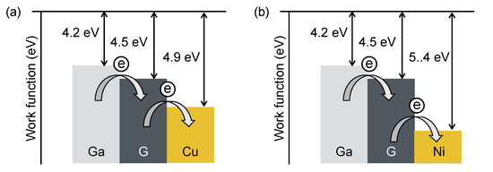 Schema of the work function and of electron transfer in the systems (a) Ga NP/G/Cu and (b) Ga NP/G/Ni