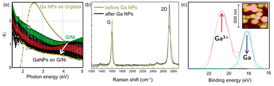 In order to demonstrate that the Ga NP/G/Cu is not a particular case and to investigate the role of the thickness of graphene, we also investigated Ga NPs on G/Ni, since it is known that the main difference between the CVD growth of graphene on Cu and Ni is that graphene is limited to a monolayer on Cu, while multilayer graphene grows on Ni. Results very similar to those of the Ga NP/G/Cu system were obtained for Ga NP/G/Ni, although in the latter, the graphene layer is a non-homogeneous mixture of bilayer and multilayer regions. Figure 4a shows the real-time evolution of the pseudo-extinction coefficient during Ga NP deposition on G/Ni. For comparison, the spectrum of equivalent Ga NPs grown simultaneously on G/glass is also shown. As in the case of G/Cu, there is no plasmon resonance peak coming from the excitation of the LSPR LO mode of the Ga NPs, although Ga NPs are clearly formed on the substrate, as demonstrated by the AFM image in the inset of Figure 4c. This behavior is consistent with the fact that G/Ni is also a conductor, like G/Cu. The experimental spectra show a damping of the Ni’s characteristic Drude-like behavior at low photon energies as well as of the peak above 4 eV coming from the interband transition of Ni [18] due to the effective thickness of the Ga NPs. The absence of any localized surface plasmon resonance in the extinction coefficient spectra is consistent with the absence of any enhancement of the Raman signal of the graphene layer, as shown in Figure 4b. Here, the variation of the intensity ratio between the G and 2D peak is not speculated because it might be due to the non-homogeneity of the graphene layer thickness. Moreover, the XPS analysis of the photoelectron core lever Ga3d also shows, in this case, a strong Ga3+ (BE = 20.8 eV) component and a quenched metallic Ga component (BE = 18 eV) [21]. This puts in evidence the loss of the metallic character of the Ga NPs due to electron transfer from the Ga NPs into the graphene and finally into the Ni substrate, according to the schema sketched in Figure 3. As shown in Figure 3b, Ga, G, and Ni have values of their work functions of = 4.2 eV, = 4.5 eV, and = 5.4 eV, respectively; thus, electrons transfer from the Ga NPs to graphene and to nickel.
