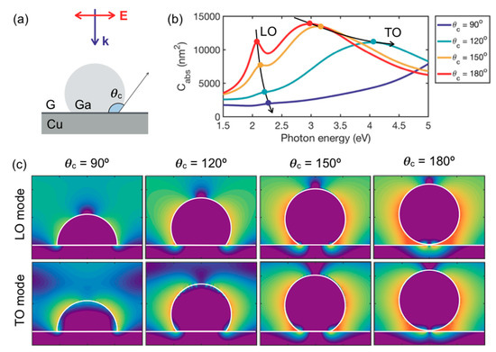 In light of this, Figure 5b shows the absorption cross-section Cabs of spherical Ga NPs of R = 55 nm illuminated at normal incidence (see sketch in Figure 5a) forming different contact angles with a G/Cu substrate: 90° (hemisphere), 120°, 150° and 180° (sphere). The Cabs spectra for the sphere ( = 180°) show two clear resonant peaks: a low-energy peak associated with a dipolar mode (related to the LO mode in the hemisphere), and a high-energy one associated with a higher-order mode (related to the TO mode in the hemisphere). The dipolar mode (LO) progressively quenches and slightly blue-shifts with the decrease of , while the higher-order plasmon mode (TO) is severely blue-shifted and damped. The near-field distribution in Figure 5c shows high enhancement at the NP–substrate boundary for the spherical nanoparticle, which decreases with the decrease in (going from the spherical to the hemispherical geometry). One of the factors affecting the near-field enhancement is the contrast between the optical properties of the NP and its surrounding medium (electromagnetic boundary conditions). Dipolar modes are produced by oscillations of the electrons at the equatorial plane of the spherical NP. For high values of the effective surrounding medium around the equatorial plane of the NP is air (high contrast, metal–insulator) leading to high near-field enhancements. This effect is additionally enhanced by the coupling of the mode to the cavity formed in the NP–air–substrate region. Moving to the hemispherical shape (decreasing values of ), the contrast between the NP and the surrounding medium decreases due to the proximity of the conducting substrate, and the near-field enhancement becomes lower. Moreover, the cavity region becomes smaller, hampering the coupling of the mode until its full disappearance at = 90°. It is worth mentioning that this mode is relevant for SERS applications [1,2]. The high-energy mode (TO mode) also shows a near-field enhancement distribution concentrated at the NP–substrate interface for the spherical case ( = 180°), due to its coupling with the cavity. As decreases, the mode gets concentrated at the nanoparticle surface, which is consistent with its TO-mode character [26].