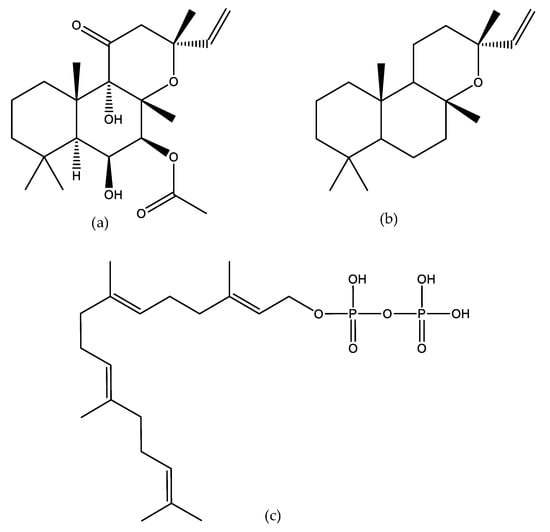 Terpenes and terpenoids are the main components of the essential oils of many types of plants and flowers. Their biosynthesis occurs within specific tissues or at specific stages of development in plants [9]. Many terpenoids also possess pharmaceutical properties and are currently being used in clinical practices. Nowadays, terpenoids intensively applied in traditional drugs are taxol (diterpene) from Taxus baccata L. and artemisinin (sesquiterpene lactone) from Artemisia annua L. as malaria and cancer medicines, respectively, and forskolin (Figure 1a) from Coleus forskohlii (Willd.) Briq. (also known as Plectranthus forskohlii Willd.) (Lamiaceae) [10,11,12,13]. Forskolin is known to treat conditions such as heart complications, respiratory disorders, and asthma [14,15].