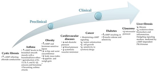 Forskolin is a naturally derived diterpenoid that can interact with the cAMP pathway. This interaction endows forskolin with significant therapeutic benefits against several metabolic diseases, cancers and others. According to a number of clinical studies reported on clinicaltrials.gov, the effects of forskolin have been studied in conditions such as asthma, cystic fibrosis, homozygous F508DEL mutation, chronic obstructive pulmonary disease (COPD), metabolic syndrome, obesity and glaucoma [27,28,29,30,31,32,33,34]. Notable clinical and preclinical studies, along with their pharmacological actions, are discussed below. Moreover, a summary of the effects of forskolin is shown in Figure 2.