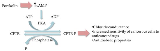 Cystic fibrosis is caused due to a mutation in the cystic fibrosis transmembrane conductance regulator (CFTR) gene [35]. Two potential drug targets can be used to treat cystic fibrosis; namely, potentiator VX-770 and corrector VX-809 linked to CFTR gene [36]. CRE sequence (TGACaTCA) present in the promoter CFTR gene has thrown more light on the processes from cAMP regulation to gene expression [37]. Around 45–50% of cystic fibrosis patients suffer from a homozygous mutation named, F508DEL [36]. In 1991, Drumm et al. reported that the association between CFTR and chloride conductance is sensitive to forskolin (Figure 3), where the order of sensitivity occurs at a similar level as the disease severity [38]. Several clinical studies are reported for cystic fibrosis, such as NCT03652090, NCT03390985, NCT03894657 and NCT02807415, where forskolin is used to analyze drug sensitivity and classification of cystic fibrosis [27,28,32,34].