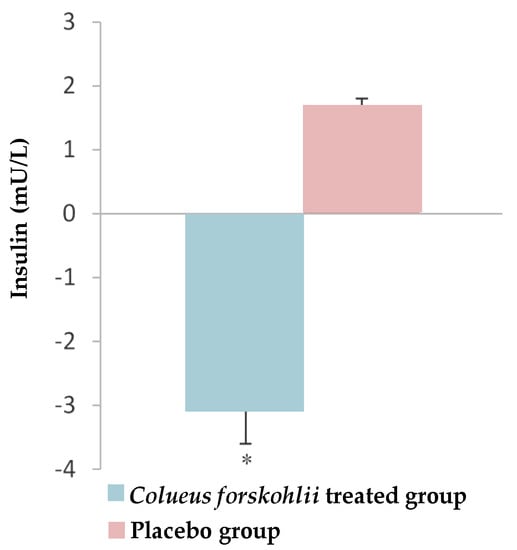 Reduction of fasting plasma insulin concentration by Coleus forskohlii extract. * Significant at p < 0.05 (adapted from [45]).