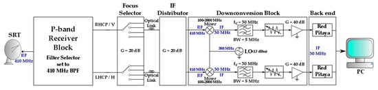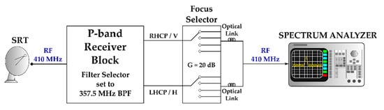 - Valente, G.; Pisanu, T.; Bolli, P.; Mariotti, S.; Marongiu, P.; Navarrini, A.; Nesti, R.; Orfei, A.; Roda, J. The Dual Band L-P Feed System for the Sardinia Radio Telescope prime focus. In Millimeter, Submillimeter, and Far-Infrared Detectors and Instrumentation for Astronomy V, Proceedings of SPIE Astronomical Telescopes + Instrumentation, San Diego, CA, USA, 15 July 2010; International Society for Optics and Photonics: San Diego, CA, USA, 2010; p. 774126. [Google Scholar]