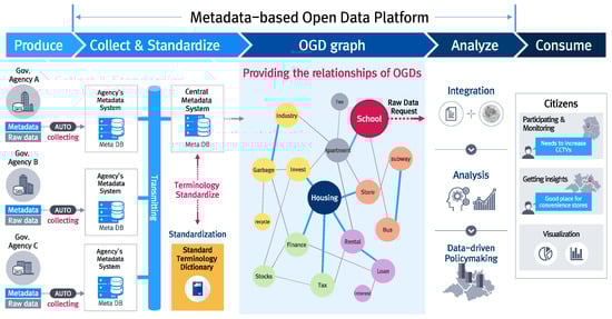 Figure 1 shows the conceptual model of an open-data platform and the data flow of the platform applied to the Korean government. The proposed open-data platform has four key features. First, whenever the metadata of OGDs in a government agency have created or modified, the changed metadata are automatically collected to the agency’s metadata system and transmitted to the central metadata system in real time (or periodically according to system settings). Second, by referencing the standard terminology dictionary, the terms, types and formats of the collected metadata are converted into the standardized metadata to share metadata with others and to analyze the relationships of OGDs in the graph. Unless the standardization of terminology is performed, data nodes (i.e., vertices) with synonyms cannot be inter-linked in an OGD graph. Third, by automatically analyzing the relationship of data nodes, the visualized form of the graph can be provided to citizens who want to get useful information. For example, by using the OGD graph, it is possible to find a set of OGDs with a single query by exploring the estimated relationships of OGDs. In addition, it is possible to know the types of OGDs and the number of OGDs that each government agency has. As a result, it may be easier to request OGDs that are not yet available to citizens on their OGD portal. Finally, by collecting metadata and requesting raw data as needed, it is possible to integrate and analyze data models and raw data from heterogeneous domains. The analyzed results can be used for government officials to enhance the accuracy of policy execution, which is typically referred to as the data-driven policymaking.