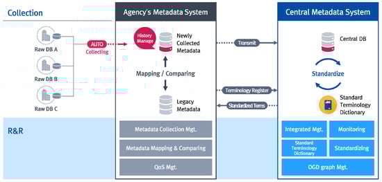 Figure 3 shows a procedure for standardizing the collected metadata in the metadata systems of agencies. As previously addressed in Section 3, the terms, types and formats of collected metadata with others and accurately compute the relationships of OGDs by eliminating synonym problems. The metadata systems of agencies are responsible for standardizing the collected metadata. To execute the assigned role, the metadata systems in agencies check whether metadata terms are existed as standard terms (or representative terms) in the standard terminology dictionary, which is maintained by the central metadata system. If the terms in the collected metadata do not exist in the dictionary, the terms should be registered as standard terms.