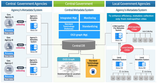 While the agencies of the central government and metropolitan cities have their own metadata systems, most local small cities do not have their own metadata systems as shown in Figure 2. In a rural area, the metadata system of a metropolitan city works as a central metadata system in the area, i.e., a metropolitan city metadata system automatically collects the metadata and raw data of local metadata systems in local small cities. By linking a metropolitan metadata system directly to the metadata systems of the local small cities, it is possible to grant the local autonomy to the metropolitan area. In addition, by linking only the metadata systems of central government agencies and metropolitan cities to the central metadata system, it is possible to enhance the efficiency of management and reduce network loads.