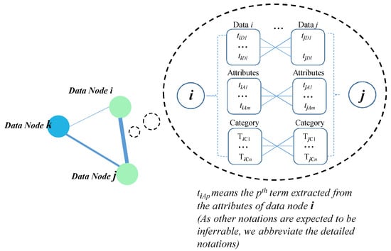where vertices are described by a set of index terms derived from the metadata such as the data names, attributes and categories. Assume that , and represent sets of index terms extracted from the data name, attribute and category of vertex i, the vertex i is formally defined as follows: