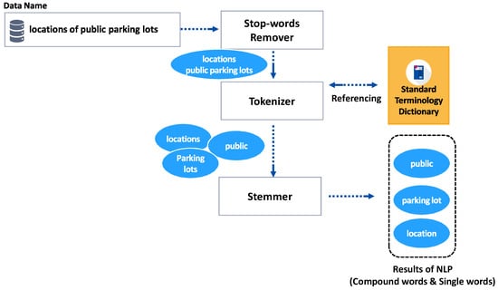 This section describes an approach for modelling the OGD graph, which is used in the proposed platform. Figure 4 shows an OGD graph structure that consists of data nodes (i.e., vertices) and their relationships (i.e., edges). Vertices represent the collected relations (i.e., tables) in the proposed platform, and a set of terms refers to compound words as well as single words that extracted from the data names (i.e., relation names), attributes and categories. Specifically, the compound words and single words extracted from data names, attributes and categories are obtained by applying Korean natural language processing operations, such as tokenization, stop-words removal and stemming [24] by referencing the standard terminology dictionary. Figure 5 shows an example of natural language processing operations with “locations of public parking lots” extracted from a data name. In fact, the proposed open-data platform executes Korean natural language processing operations, but this paper provides an example of English natural language processing operations to enhance readers’ understanding. First, a preposition “of” is removed by stop-words remover. Then, Tokenizer extracts single words and compound words (such as “locations”, “parking lots” and “public”) by referencing the standard terminology dictionary which contains standard terms and their synonyms. After stemming the extracted plural words, the singular words such as “public”, “parking lot” and “location” are provided as the results of natural language processing operations. Finally, the derived words are exploited to model the OGD graph, which is shown in Equation (2).