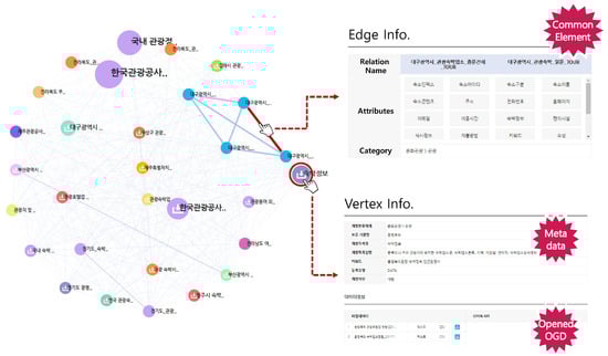 In Figure 6, openable OGDs are represented by colored vertices, while opened OGDs are represented by colored vertices with arrows. That is, the OGDs with arrows can be immediately downloadable on the portal. The size of a vertex indicates how relevant the data is to a given user query, and the relevance of the vertex to the query is derived from the applied search engine. When a user clicks a vertex on the graph, he/she can see details of OGD such as the category of the OGD, government agency name, descriptions and keywords. To access the OGD graph with 89,501 vertices on the Korean OGD portal, please visit the portal. Currently, the knowledge graph is only available in Korean [25].