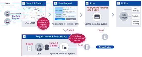 Figure 7 shows a procedure for requesting and delivering raw data. In this example, it is assumed that a user finds raw data of heterogeneous domains to perform decision-making. First, the user searches for OGDs of heterogeneous domains with a single query in the OGD graph, and he/she selects some OGDs for his/her decision-making. Second, the user fills down and submits the raw data request if the selected OGDs are not yet available. Third, a database administrator (shortly, DBA) reviews the raw data request submitted by the user. If the request is appropriate and there is no data limitation, the DBA will extract and upload the raw data to the agency’s metadata system. Fourth, after anonymizing personal information such as the social number, mobile number and so on, the raw data is stored in the repositories of the central metadata system. Finally, the raw data is analyzed in a variety of ways to make the correct decision. The data analysis methods such as Text Mining, Statistics and Machine Learning can be selected based on the features of the delivered raw data or the purposes of applications.