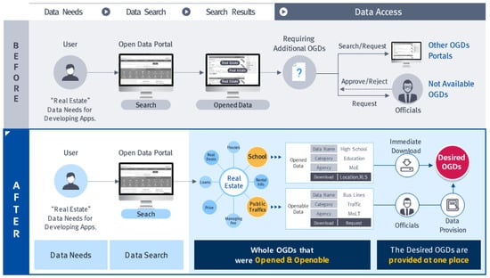According to Kalampokis et al. [4], since the availability of OGDs in the private sector has increased, numerous OGD portals have been launched to provide a single access point to the government data in various domains. As the number of OGDs and the diverse needs of users have increased sharply, citizens have begun to complain that it is difficult to get proper OGDs in the desired form whenever they need it. This is because only OGDs that governments intend to disclose to citizens are registered with their OGD portals. In other words, ordinary citizens cannot know which government agencies produce and hold openable data (not yet provided to their citizens) and to whom they can request the desired OGDs.