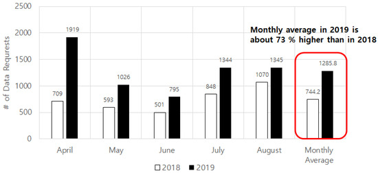 Moreover, as the whole openable OGDs are shown in the OGD graph, we can expect a significant increase in the number of raw OGDs requests from users. Since the goal of the Korean government is to promote the use of OGDs significantly and to revitalize the data industries in Korea, the OGD graph was planned and released to enhance citizens’ accessibility to OGDs. In our work, we assume that improving the citizens’ accessibility to OGDs is directly proportional to increasing their OGDs requests and usage. The raw data request log on the open-data platform is analyzed to verify whether our assumption is correct or not. The OGD graph described in this paper was first released to citizens in April 2019, thus 10,150 raw data requests in the same period (i.e., from April to August) of 2018 and 2019 are collected and analyzed to see the effects of an OGD graph release. As shown in Figure 9, for all the given time periods, there are more raw data requests in 2019 than in 2018. Specifically, the monthly average of raw data request in 2019 is about 73% higher than one in 2018, which is highlighted with the red box in Figure 9. This is because the whole OGDs that are already available or not yet available are shown to citizens. In this section, our analysis revealed that showing the whole OGDs held by government agencies (i.e., improving user accessibility to OGDs) could significantly increase the usage of OGDs in private sectors.