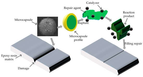 - For the mechanical damage, the microcapsule/epoxy resin composite exhibit excellent self-healing ability. The repair efficiency of scratch width is 70%~100%, and the repair rate is relatively fast. Moreover, the core material of the microcapsule has great fluidity and reactivity. In addition, the repair process is mainly affected by the action of the capillary and molecular diffusion model on the defect surface.