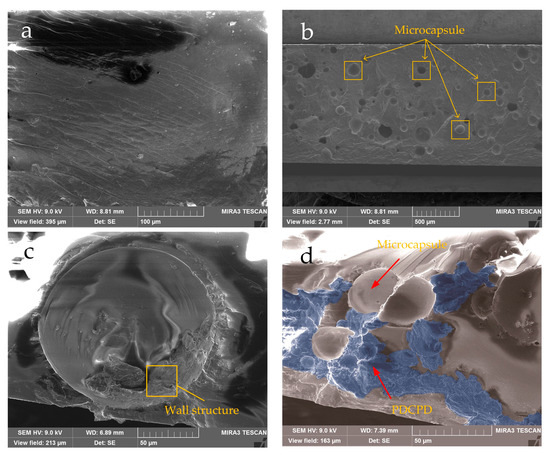 The SEM results of cross-section are showed in Figure 5. From Section 3.1.1, the repair behavior was concentrated in the first 30 min. So, the samples of cross-section were heated for 30 min. Compared with the pure epoxy resin, there are obvious microcapsules in the composite. And the dispersion of microcapsules is great, which is similar to the OM results in Figure 1. Moreover, the microcapsule has obvious core-wall structure and it can be damaged in the cross-section operation (as shown in Figure 5c). It indicates that the wall structure of microcapsule has the rupture response to the stress change of insulating material.