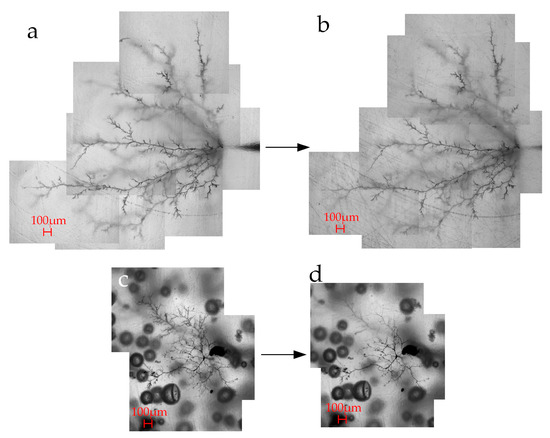 In the actual operation process, the electrical tree is the main factor leading to the insulation failure of insulating material [30]. The electrical tree can cause the irreversible structural damage of micron and above, thus directly threatening the safe operation of power system [30,31]. Therefore, the self-healing performance to electrical tree can greatly improve the service life of insulating material. However, there are still few reports about it. This paper mainly studies the propagation stage of electrical tree in epoxy resin. The results are shown in Figure 7. From Section 3.1.1, the heating condition is 60 °C/30 min. This paper observes the panorama of the electrical tree by the mosaic of multiple graphs to ensure the clarity.