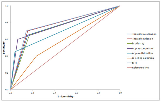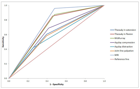 Combined sensitivity of the meniscal test was 91% for the medial meniscus. The most sensitive test used in the diagnostics of medial meniscus lesions was the McMurray test, which showed a sensitivity of 87.5% with 52% specificity. Comparable sensitivity and specificity were shown in regards to the Thessaly test, 85.4% and 54%, respectively. The diagnostic accuracy of the Thessaly test was shown to be dependent on the range of motion (ROM) of the joint. If incomplete ROM was noted, the accuracy of the examination dropped significantly (p = 0.012). Palpation of the joint line showed significantly lower diagnostic accuracy than all other tests in this study (p = 0.113). The greatest area under curve on (AUC) on the ROC graph was shown for the McMurray and Thessaly tests. Except for joint palpation, there were no statistically significant differences between all the tests used in the diagnosis of medial meniscus lesions.