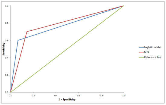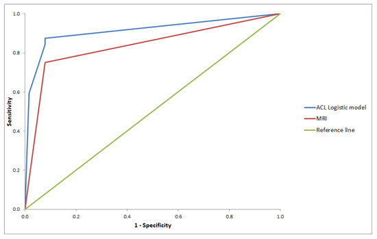 In order to determine the accuracy of the sets of the diagnostic methods, a logistic regression analysis was applied by assessing the prediction based on their actual state, which was evaluated during an arthroscopy of the knee joint. The best set of predictors (diagnostic tests) was sought in this analysis using the reverse selection method. After obtaining the best set of clinical predictors for logistic analysis, the diagnostics of clinical test sets were compared with magnetic resonance results, introducing an appropriate resonance result. The sensitivity and specificity of each study were calculated on the basis of ROC curves. Statistically significant results were those that were significant at the typical materiality level (i.e., when p < 0.05).