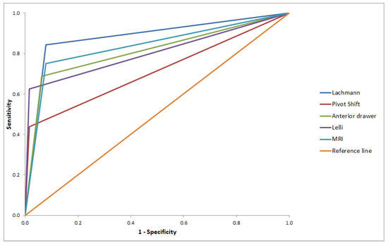 ROC curve describing the relation of sensitivity to specificity in diagnostic tests for the anterior cruciate ligament.