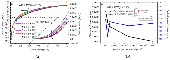 - Basak, S.; Asthana, P.K.; Goswami, Y. Leakage current reduction in junctionless tunnel FET using a lightly. doped source. Appl. Phys. 2015, 118, 1527–1533. [Google Scholar] [CrossRef]