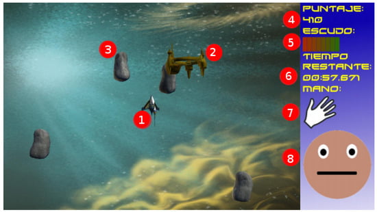 The main objective in SIBMER is to control a spaceship that crosses portals while avoiding asteroids and collects time spheres in a virtual 2.5D environment. The movements of the hand are mapped into the movements of the ship through the Microsoft Kinect sensor. The score is increased each time the ship crosses a portal and is reduced each time it collides with an asteroid; the ship has a shield whose intensity is reduced each time the spaceship collides with an asteroid. In the Head-Up Display the intensity of the shield is shown on the right side (see Figure 1). The game ends in two ways: when the ship reduces the intensity of the shield to zero or when time runs out; however, the user can obtain a time bonus every time he captures a time sphere. There is also auditory feedback through sounds that are reproduced when the user crosses a portal or captures a time-lapse, and visual feedback through a graphical face that smiles, grieves or remains expressionless depending on the user performance.