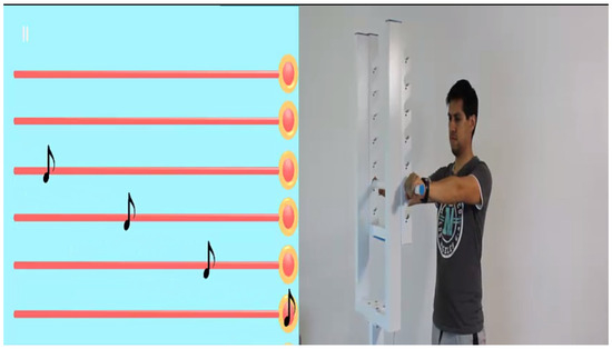 The objective of the game in its two versions is to perform the same number of flexion exercises as notes appear on the staff by placing the bar on the device for a period of time, which was set to one minute.