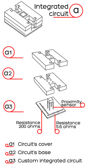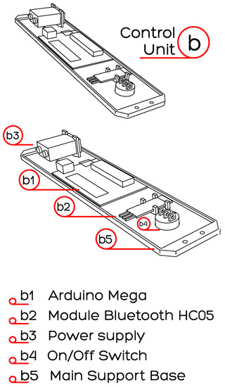 Each custom integrated circuit (Figure 5(a3)) has a proximity sensor and two resistance, an acrylic base (Figure 5(a2)) and an acrylic cover (Figure 5(a1)). The control unit has an Arduino mega (Figure 6(b1)), a Bluetooth module (Figure 6(b2)), a power supply (Figure 6(b3)), an on/off switch (Figure 6(b4)) and a main support base (Figure 6(b5)). All software and hardware elements were developed in-house.