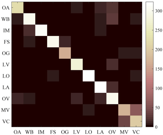 The confusion matrix of classification results is presented in Figure 2, where the tick label annotations are OA: on-demand audio; WB: web browsing; IM: instant message; FS: file sharing; OG: online game; LV: live video; LO: location; LA: live audio; OV: on-demand video; MV: meeting video; and VC: voice call. Further, Table 4 shows the Precision, Recall Rate, and F1 Score of all the network service types, where Precision, Recall Rate, and F1 Score are defined as