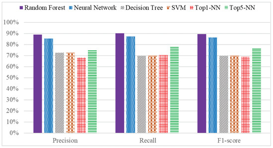 We compare the classification performance between our applied random forest and other popular classifiers, e.g., support vector machine (SVM), feedforward neural network (NN), and top-K nearest neighbors (top1-NN and top5-NN); the results shown in Figure 3 suggest that the random forest classifier outperforms the other classifiers in Precision, Recall Rate, and F1-Score.