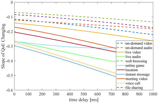 We assume that lays in the range of , meaning the time delay is between 0 and 1000 milliseconds. The sensitivity curves of five services are drawn in Figure 4, and it can be seen that their absolute values have the following relation, > . Also, note that in the range ms of , the on-demand video service and on-demand audio service curves are approximately coincident, which lead to the following conclusions.