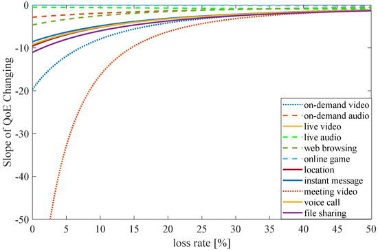 - The values of all the curves are less than 0 in the entire packet loss rate analysis domain, which indicates that the increasing packet loss rate has a negative effect on all QoEs of the data service, which will lead to the attenuation of QoE.
