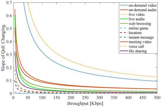 We assume that TH takes the range from 0 to 500 Kbps, the QoE changing slope values in Figure 6 can be described as . Further, we can make the following conclusions: