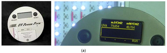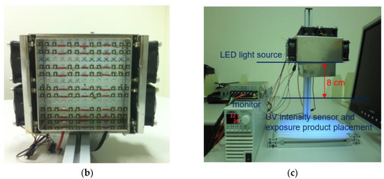 Measuring instruments: (a) EIT UV Power Puck, (b) Model of type A in actual process, (c) The light source is 8 cm away from the UV intensity sensor, and the exposure product has the same placement as it.