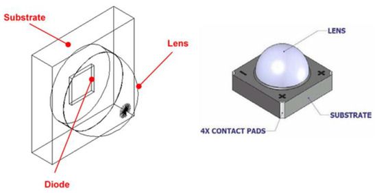 In this study, we use the TracePro software to carry out the analysis. In order to reduce the simulation error, we first carried out simulation and experimental verification of a single LED and used the same specification of LED in the experiment. Figure 2 shows an LED model, which can be divided into three parts: substrate, lens, and diode.