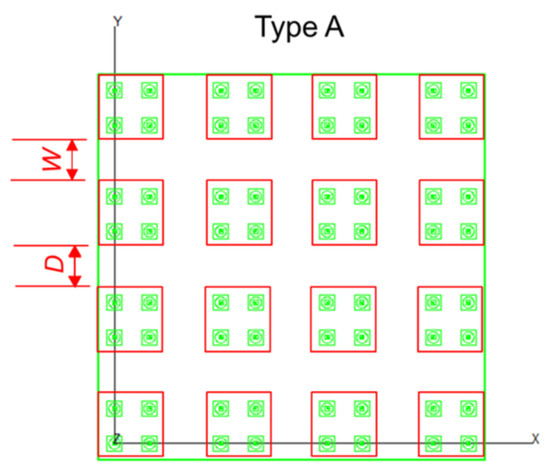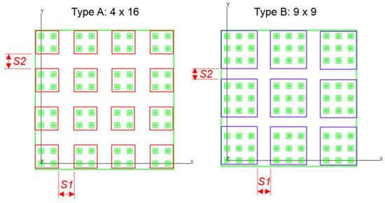 The design variables are the distance S1 in the transverse direction, and the vertical distance S2, as shown in Figure 4. We change the spacing between each area to observe the resulting uniformity and luminous intensity. Figure 5a is the type A: 2 × 2 LED area arrangement (a total of 64 LED), while Figure 5b is the type B: 3 × 3 area arrangement (a total of 81 LED).