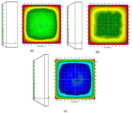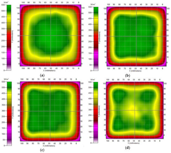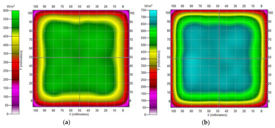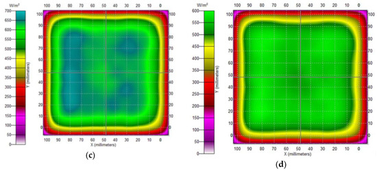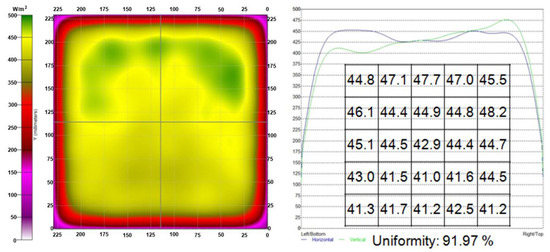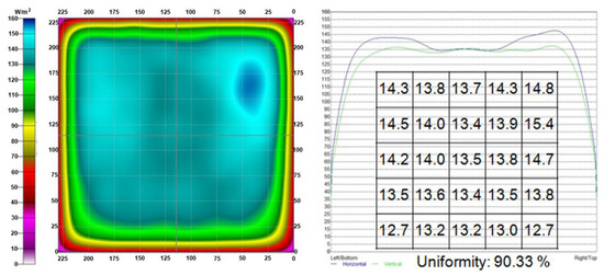 However, the light intensity of the edge is also observed to be weak, resulting in a decrease in the overall uniformity, as shown in Figure 13b and Figure 14b. We thus removed 4 LED from the central area and found that its uniformity slightly increased. As shown in Figure 13c and Figure 14c, the uniformity increased from 88.47% to 90.34%.