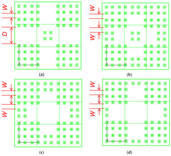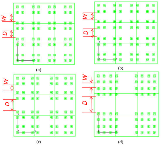 Type (a): D = 1.44 cm, W = 1.44 cm; Type (b): D = 1.6 cm, W = 1.36 cm; Type (c): D = 2 cm, W = 1.16 cm; Type (d): D = 2.88 cm, W = 0.72 cm. The LED arrangement and simulation results are shown in Figure 11 and Figure 12 and Table 6.
