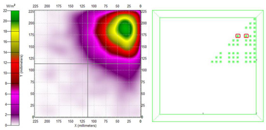 Figure 15 shows the best LED arrangement from the simulation results. The luminous intensity of the central area is still too strong (Figure 16), and the luminous intensity of each corner needs to be strengthened.