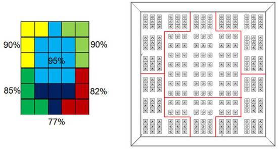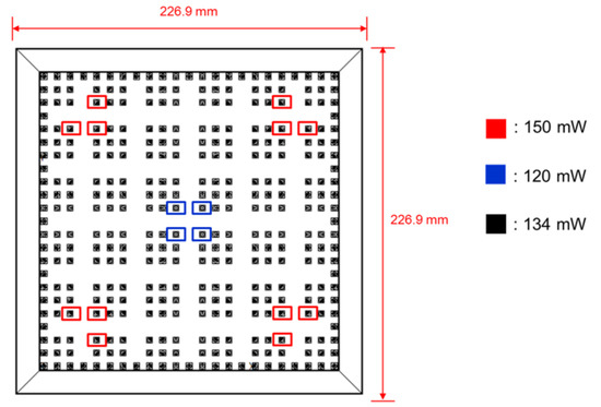 After finding the influential LED, we reduced the LED power on the center area, and increased the LED power on the corner area, with the details shown in Figure 20. The red areas have increased power from 134 to 150 mW, and the blue areas have decreased power from 134 to 120 mW. Figure 21 is the simulation results for these adjusted powers, and the uniformity is 96.72%.